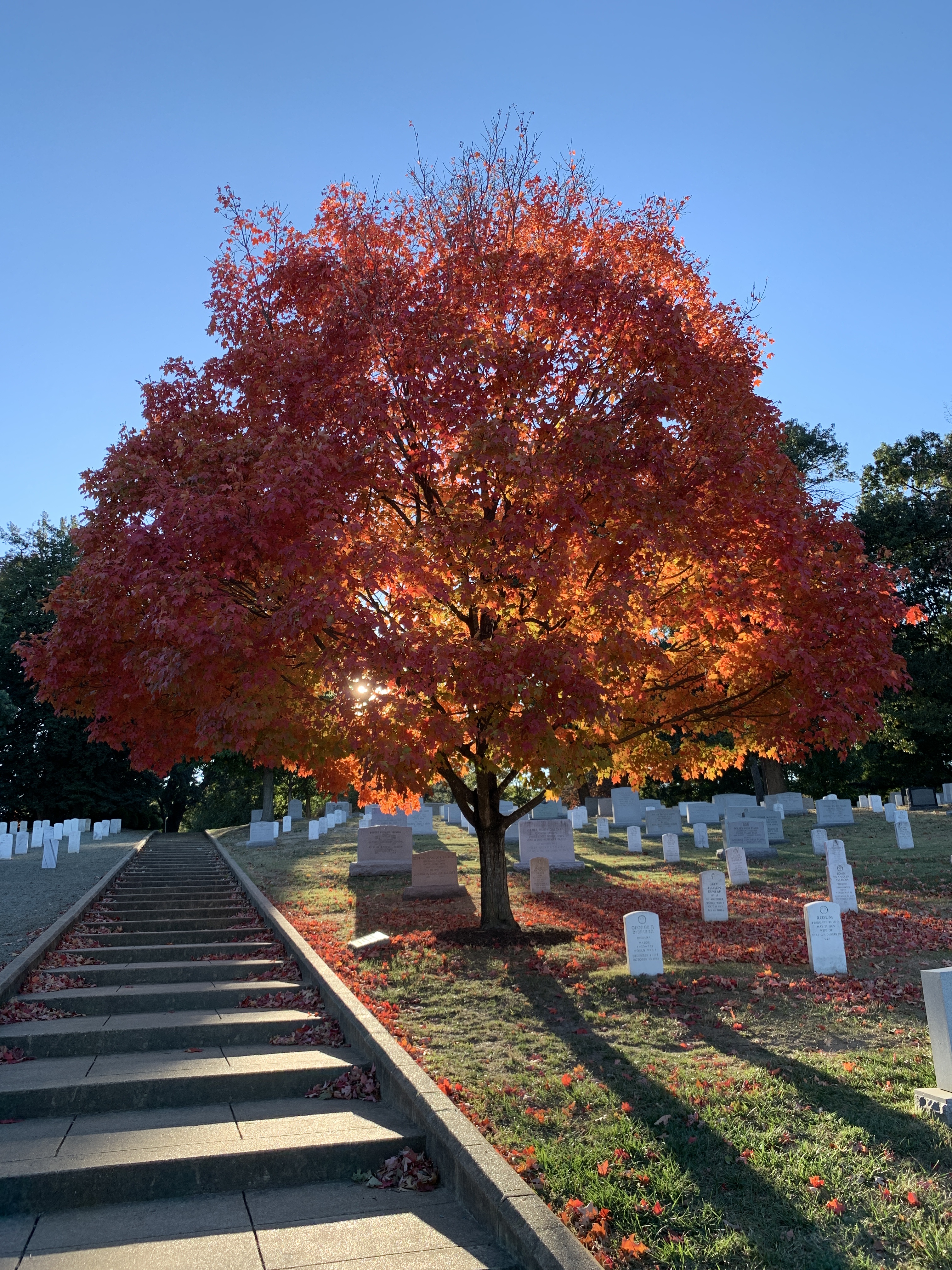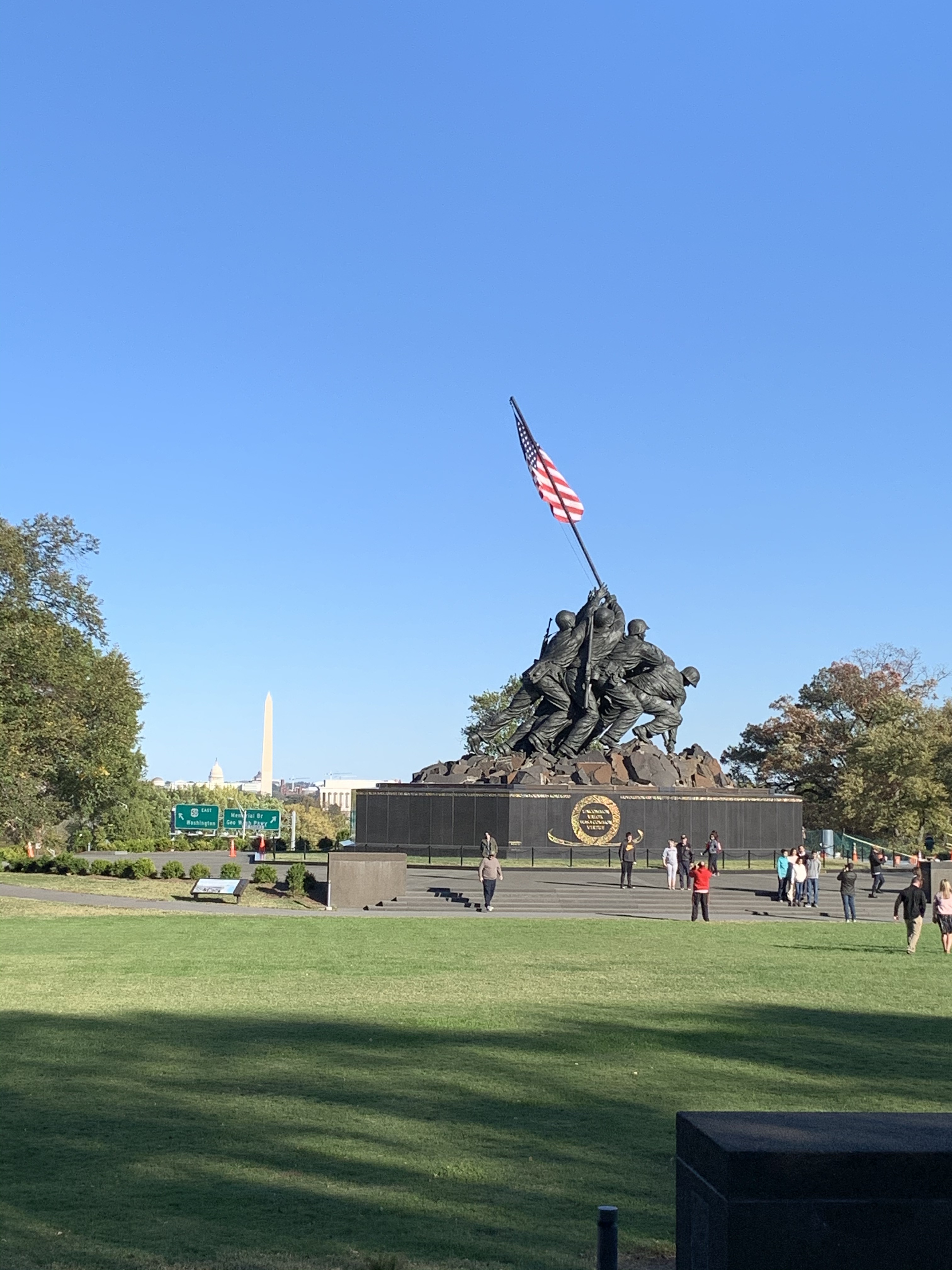 Nach einer kurzen Mittagspause gehen wir noch ein Ausflugsziel an: der Arlington Nationalfriedhof. Bevor wir den Friedhof betreten, schauen wir vom Marine Corps War Memorial auf die Stadt Washington. Das Washington Monument ist auch von hier aus deutlich zu sehen und macht Lust auf Erkundungstouren in den nächsten Tagen.