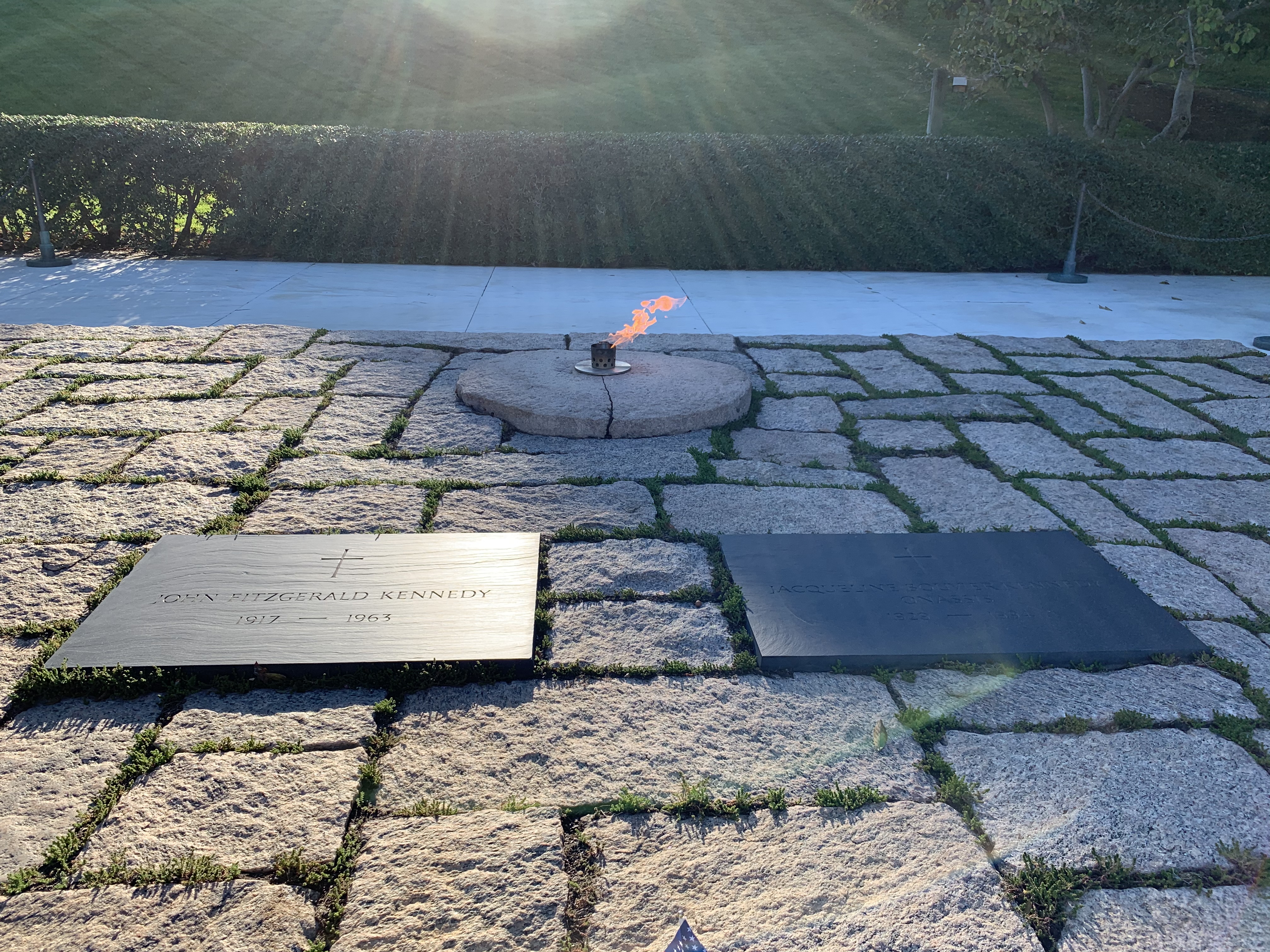 Am Eingang des Friedhofs angekommen, wurde uns klar, dass wir uns beeilen mussten, denn bis zur Schließung blieben uns nur 45 Minuten übrig. Schnell an der Sicherheitskontrolle fragen, wie wir am Schnellsten zum Grab von John F. Kennedy kommen und los. Schier entließ Gräberreihen, auf denen Dienstgrad und Kriegsbeteiligungen sowie eventuelle Ehrenabzeichen sichtbar sind, umhüllen Bäume und diesen parkähnlichen Friedhof.